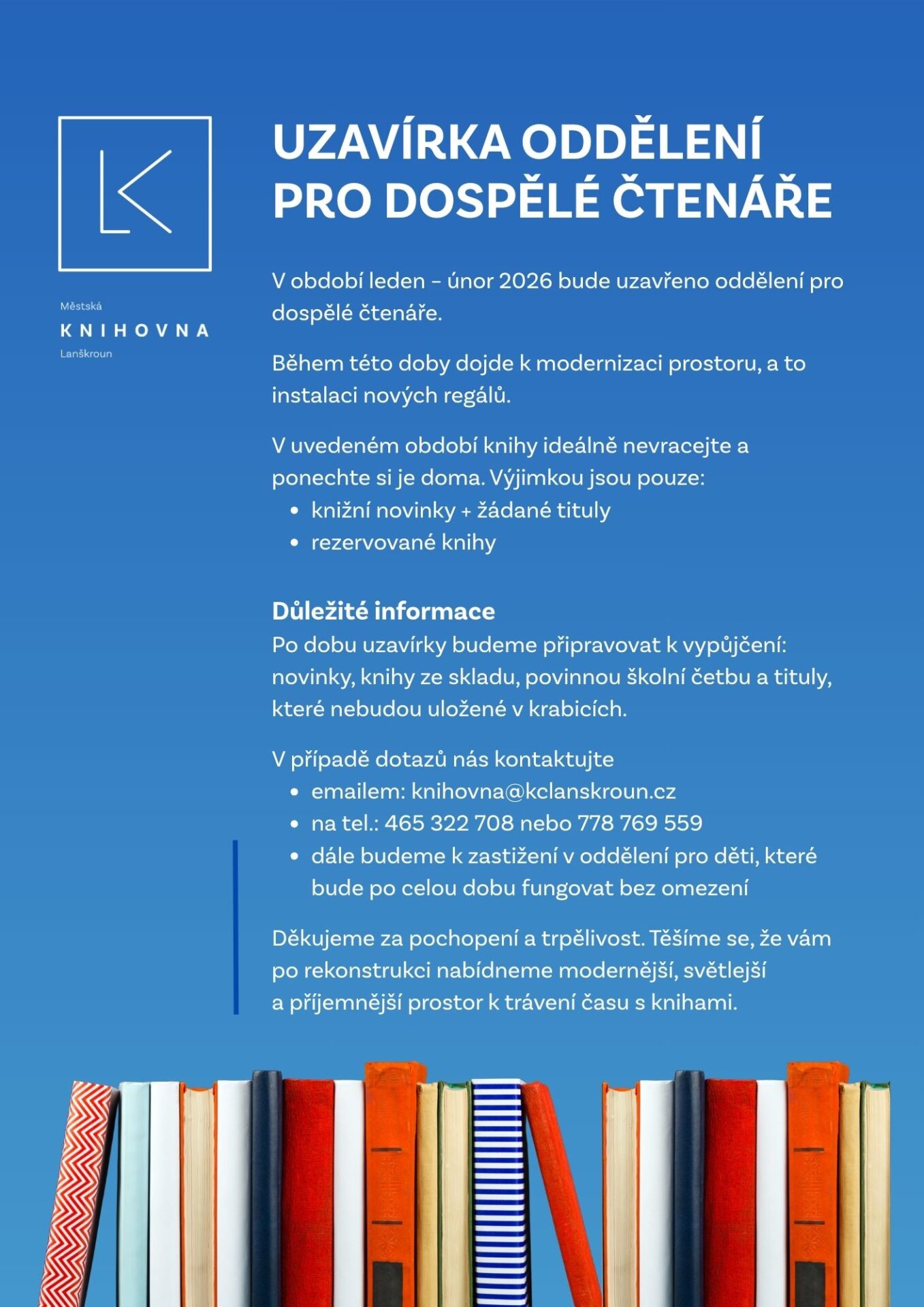 Uzavírka oddělení pro dospělé čtenáře v lednu a únoru 2026